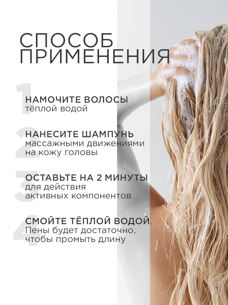 Его деликатная формула мягко очищает, создавая богатую пену, не пересушивая кожу головы и не вымывая цвет окрашенных волос.