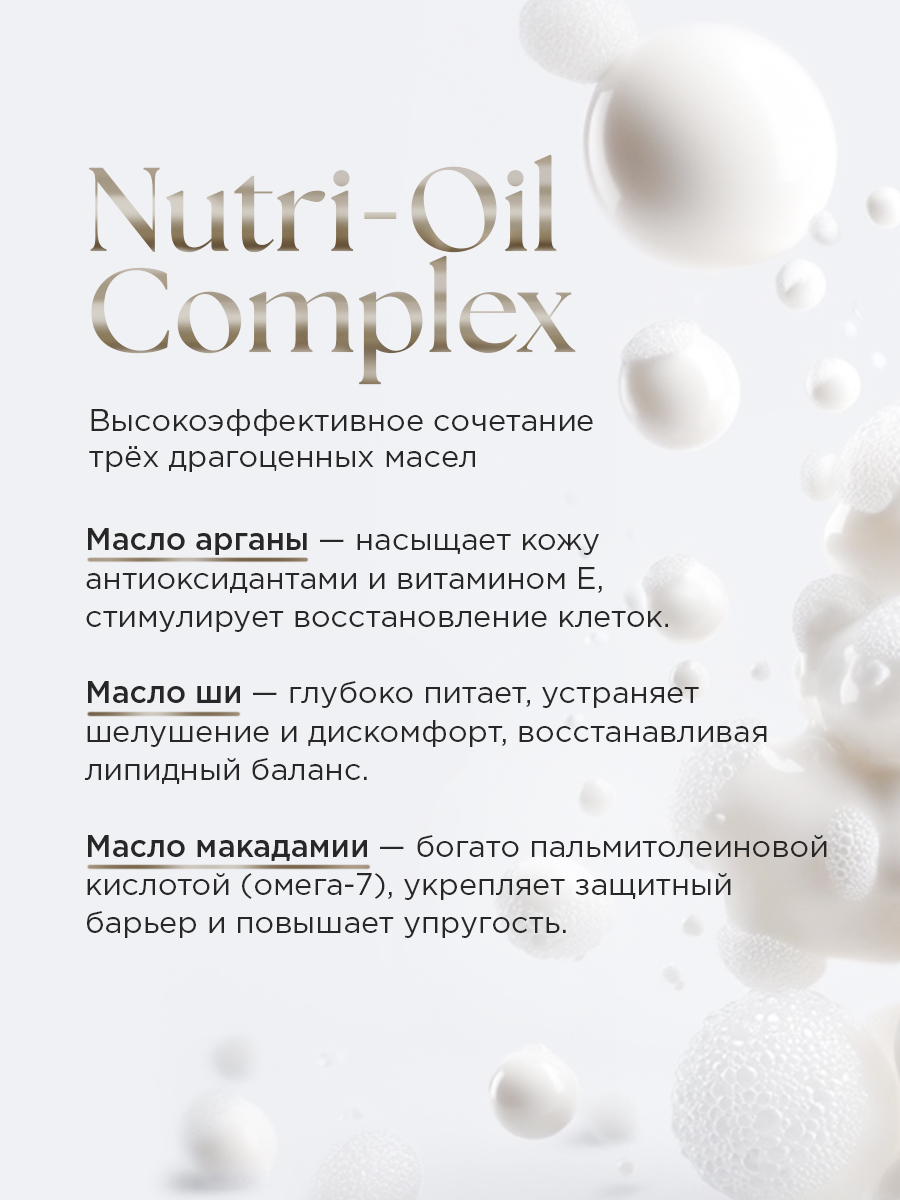 Nutri-Oil Complex сочетает три ценных масла — арганы, ши и макадамии. Они глубоко питают и восстанавливают кожу, устраняют сухость и шелушение, повышают упругость и эластичность.