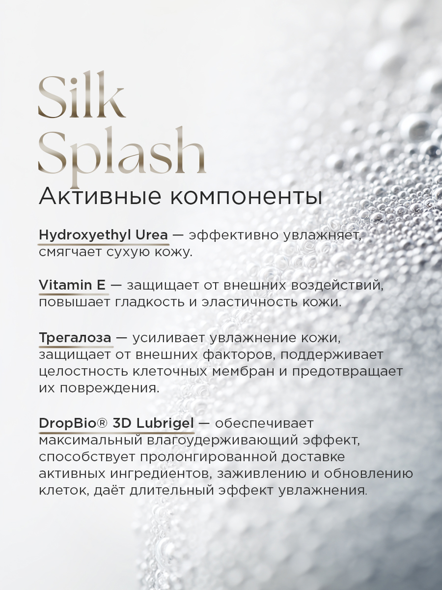 Инновационный DropBio® 3D Lubrigel* обеспечивает пролонгированный эффект увлажнения, способствует заживлению и клеточному обновлению, усиливая доставку активных ингредиентов в глубокие слои кожи.