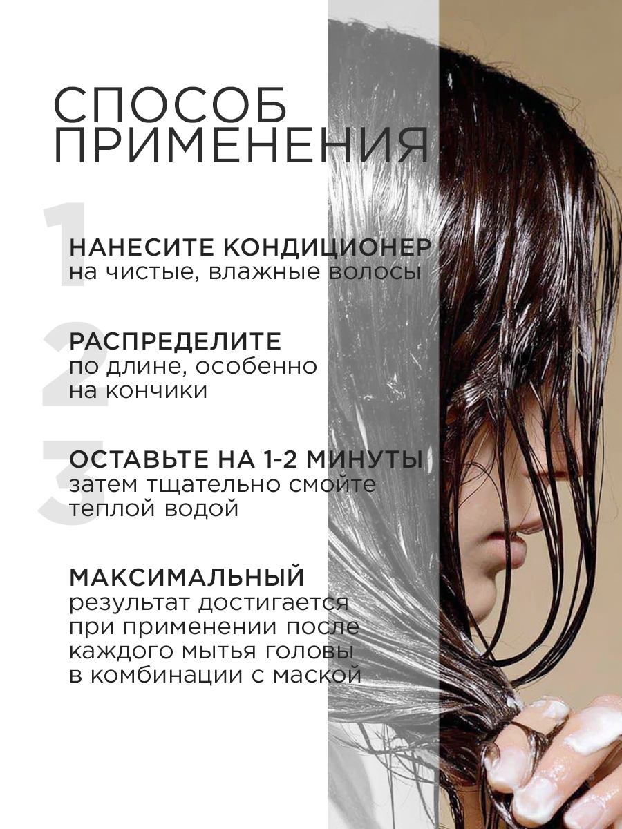 Кондиционер глубоко увлажняет, облегчает расчёсывание и защищает от внешних воздействий, не утяжеляя волосы.