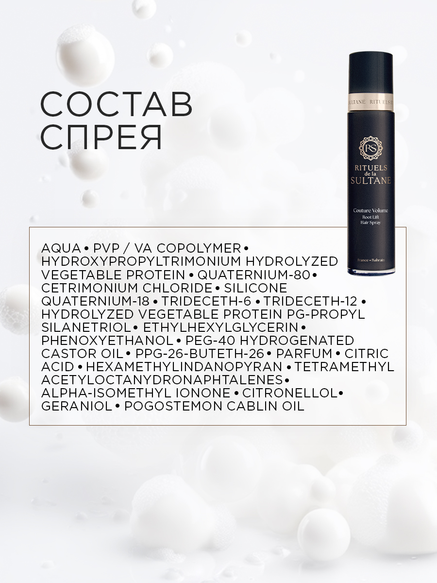 Благодаря стайлинговому сополимеру спрей помогает зафиксировать прикорневой объём на весь день, не утяжеляя волосы.